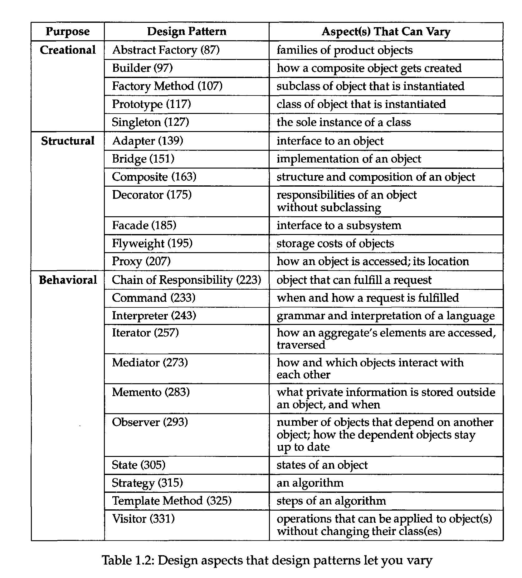 patterns. Table 1.2 lists the design aspect(s) that design patterns let you vary